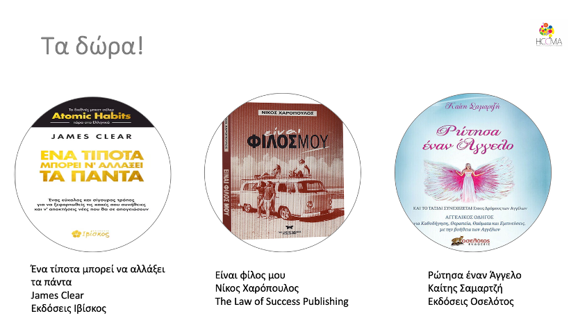 Τυχερές της διαδικτυακής συνάντησης ήταν η Ζέττα Τσαπραλή, που κέρδισε το βιβλίο Ένα Τίποτα μπορεί να Αλλάξει τα Πάντα, ευγενική χορηγία των εκδόσεων Ιβίσκος, και η Τριάς Βαφειάδου, που κέρδισε το βιβλίο Ρώτησα έναν Άγγελο, ευγενική χορηγία της συγγραφέως Καίτης Σαμαρτζή.