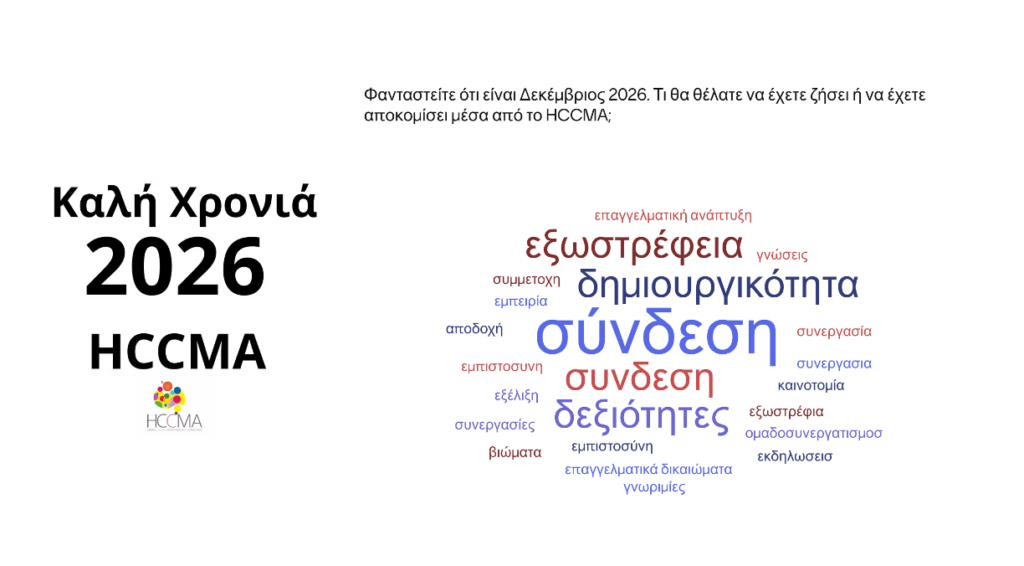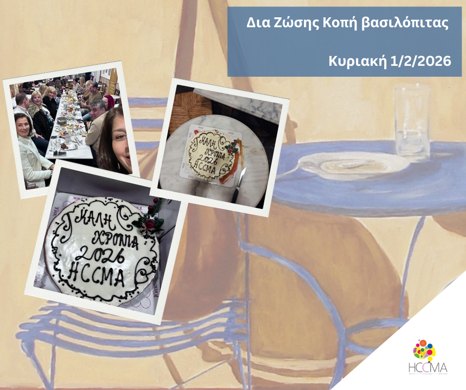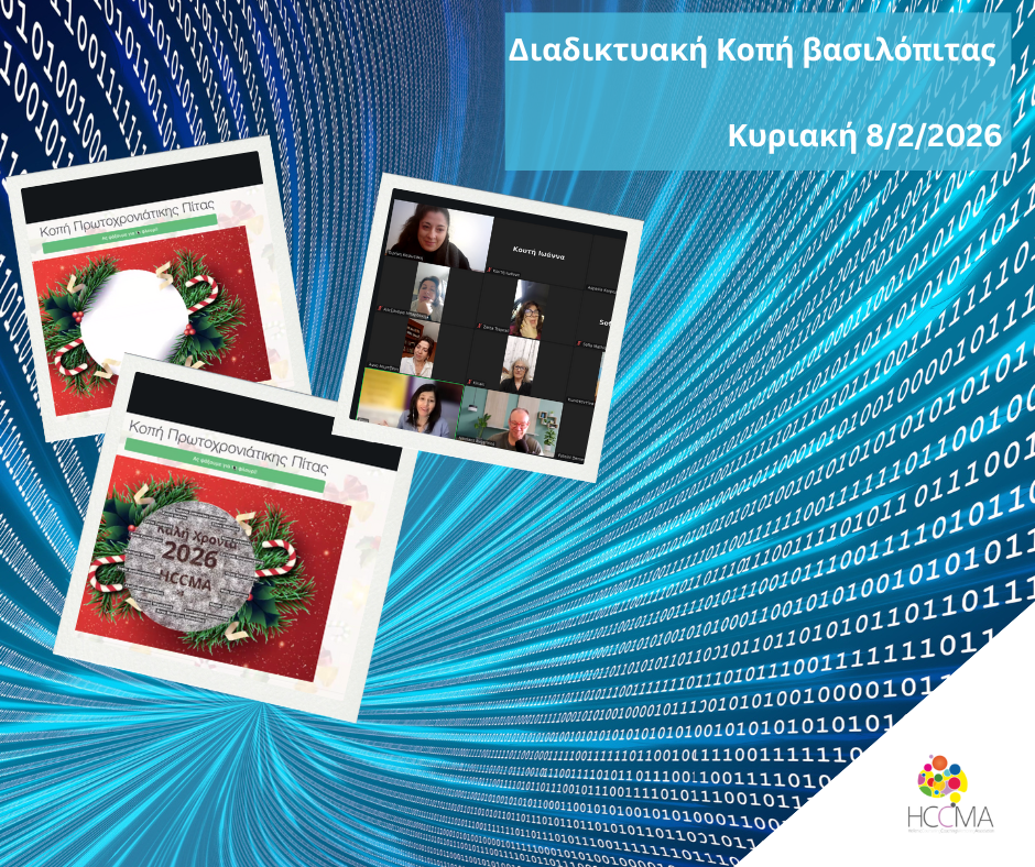 Λίγες ημέρες αργότερα, την Κυριακή 8 Φεβρουαρίου, πραγματοποιήθηκε και η διαδικτυακή κοπή της πίτας, αποκλειστικά για τα μέλη του Συλλόγου από όλη την Ελλάδα και την Ευρώπη. Σε αυτή τη συνάντηση, ανταλλάξαμε ευχές, δημιουργήσαμε “Το Συλλογικό Όραμα των Μελών του HCCMA για το 2026” με όσα θέλουμε να αποκομίσουμε και να βιώσουμε μέσα στο 2026 μέσω των δράσεων του Συλλόγου και κόψαμε τη διαδικτυακή μας πίτα.